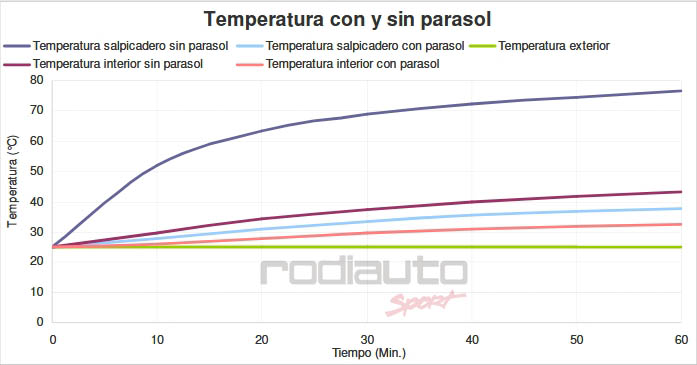 Posteriormente se puso a un coche con parasol bajo las mismas condiciones. Después de una hora se comprobó que la temperatura del salpicadero alcanzaba los 38 ºC, prácticamente la mitad de lo registrado sin la protección. La temperatura media del interior se situó en 32 ºC, un valor que está 11 ºC por debajo del anterior intento y que es mucho más asimilable para el ser humano.