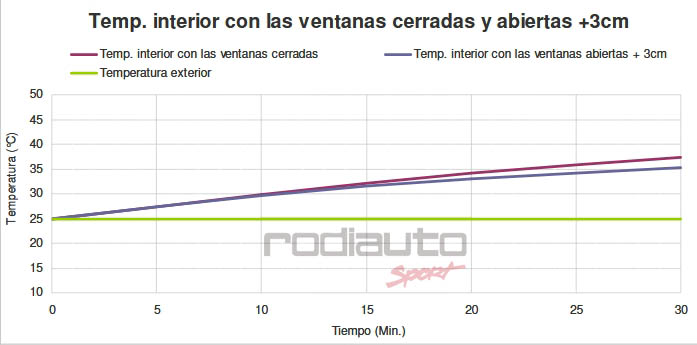 En un informe informe elaborado por el RACC (os recomendamos su lectura) se ensayaba exponiendo el vehículo a una temperatura exterior de 25 ºC y a unos niveles de radiación equivalentes a las que tendríamos en esta época durante un tiempo de 60 minutos.