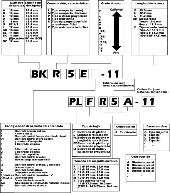 Si observas el código que figura en una de tus bujías, además del número que indica el grado térmico hallarás mucha más información. Aquí dejamos esta tabla de equivalencias que esperamos pueda serte útil.