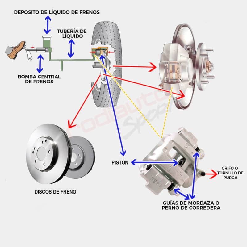 De un depósito, baja líquido, el cual ingresa a un embolo o pistón en una bomba, y al presionar el freno de pie, es enviada, presión hidráulica, la cual presiona un segundo pistón o embolo (este es de la mordaza de freno), generando fuerza en las pastillas o balatas, para que sujeten el disco y detenga el automóvil.